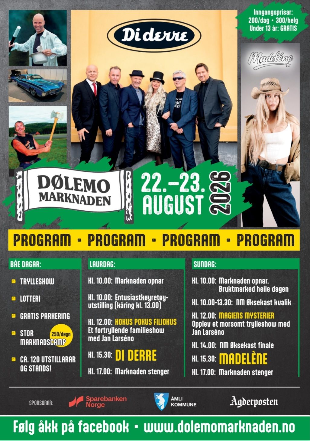 Campingområdet ligger rett ved siden av marknadsområdet. Ta med deg vogna, bobilen eller teltet og få med deg alt som skjer på Dølemo marknadshelga!